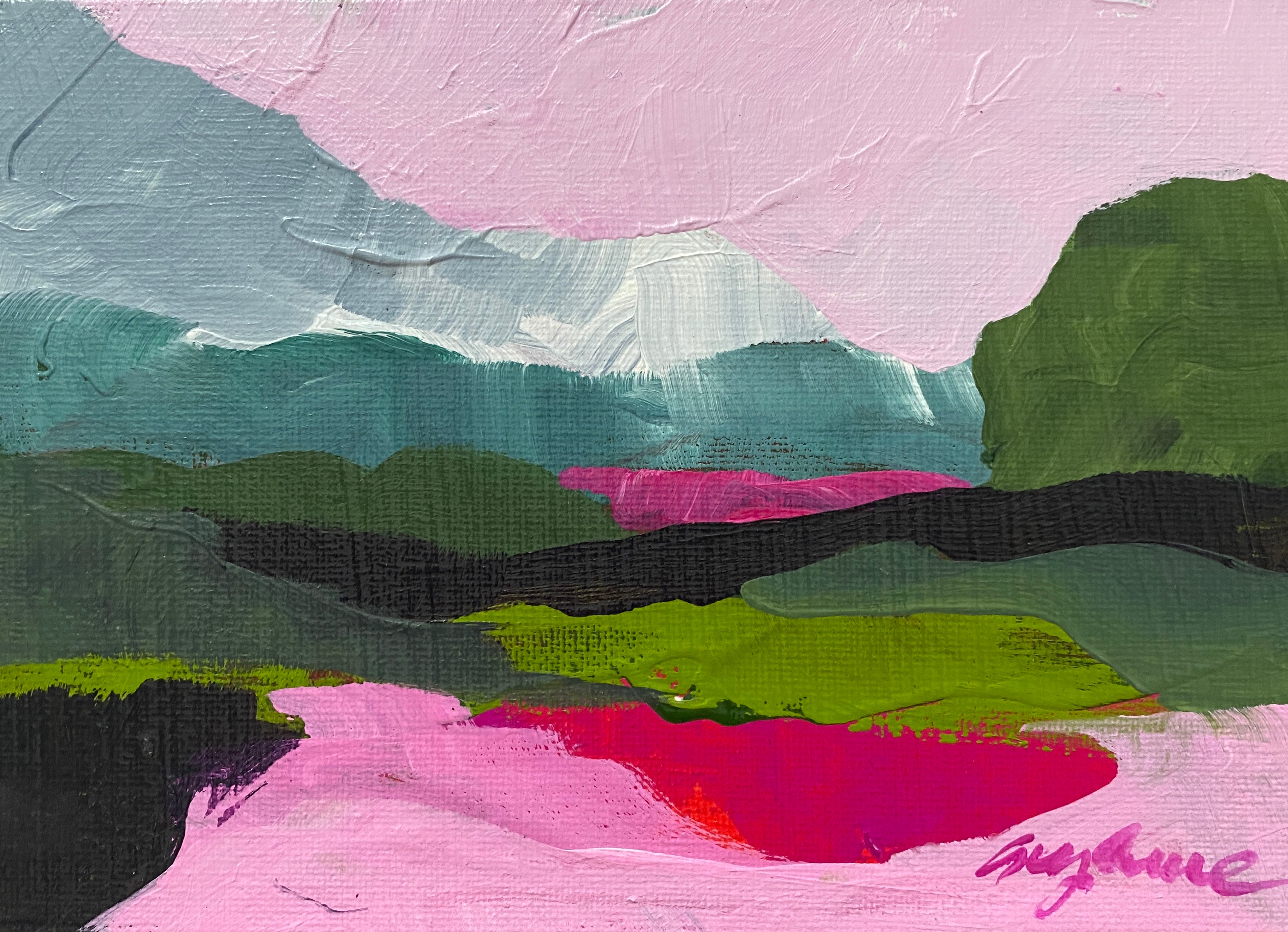 Suzanne absolutely loves color and patterns, and it shows in her work. She often uses an organic process of dripping and layering paint to achieve the effect she’s looking for. Her inspiration comes from the landscapes and people around her. She considers her work as an ongoing exploration, endeavoring to portray the natural and cultural world and those who live in it as strangely beautiful -- yet enormously fragile. Suzanne recently moved back to Virginia from Champaign, Illinois where she met her husband and raised her two wonderful children. Her academic degrees include a landscape architecture degree with an art minor from Virginia Tech and a masters of landscape architecture from University of Illinois. She’s always loved to draw and paint, and when she decided to drop organic chemistry for drawing, and forestry for landscape architecture she knew the creative path was calling her home! She’s painted much of her life, and began exhibiting professionally in the Midwest over the past fifteen years. Now she looks forward to making connections on the East Coast. She happily lives outside of Charlottesville with her husband, her dog and cat, and her mom.
