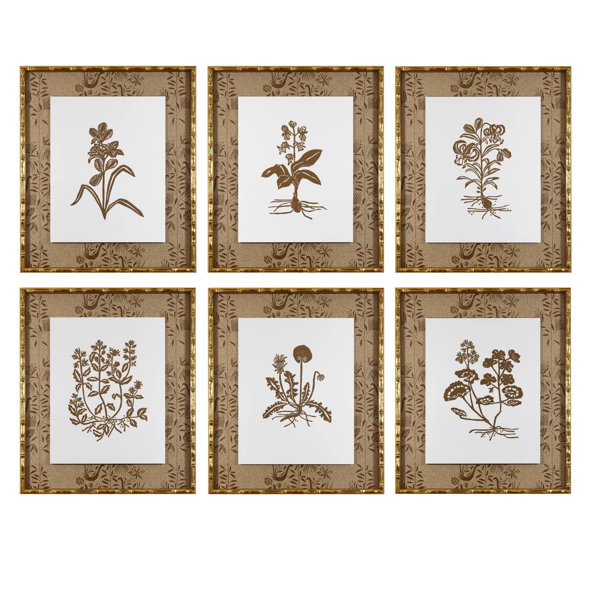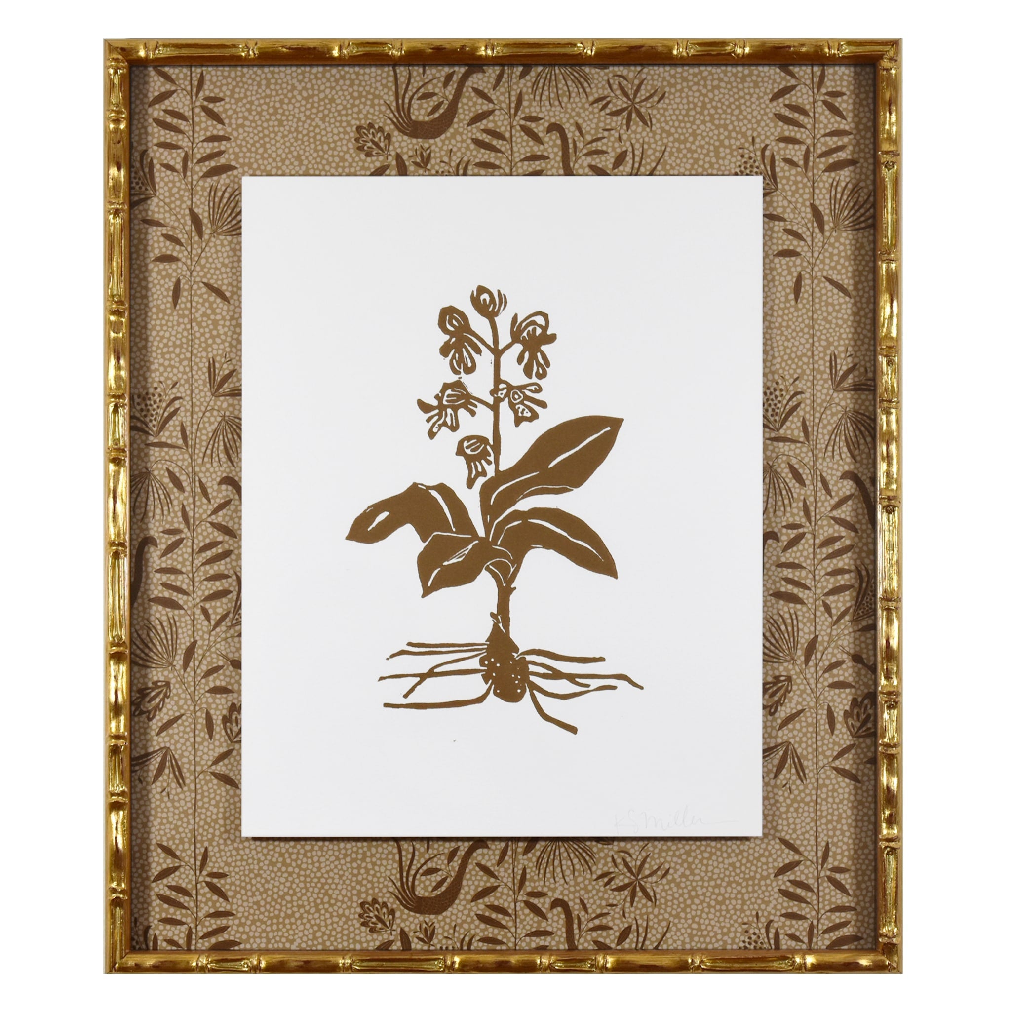 hand carved and hand printed linocut floating on garden vine wallpaper, framed in gold bamboo frame