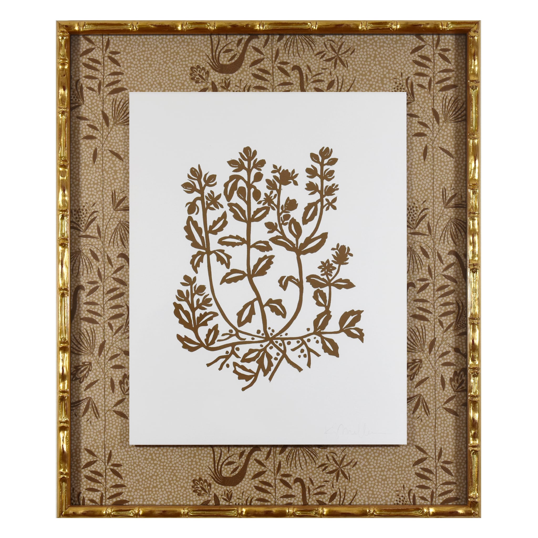 hand carved and hand printed linocut floating on garden vine wallpaper, framed in gold bamboo frame