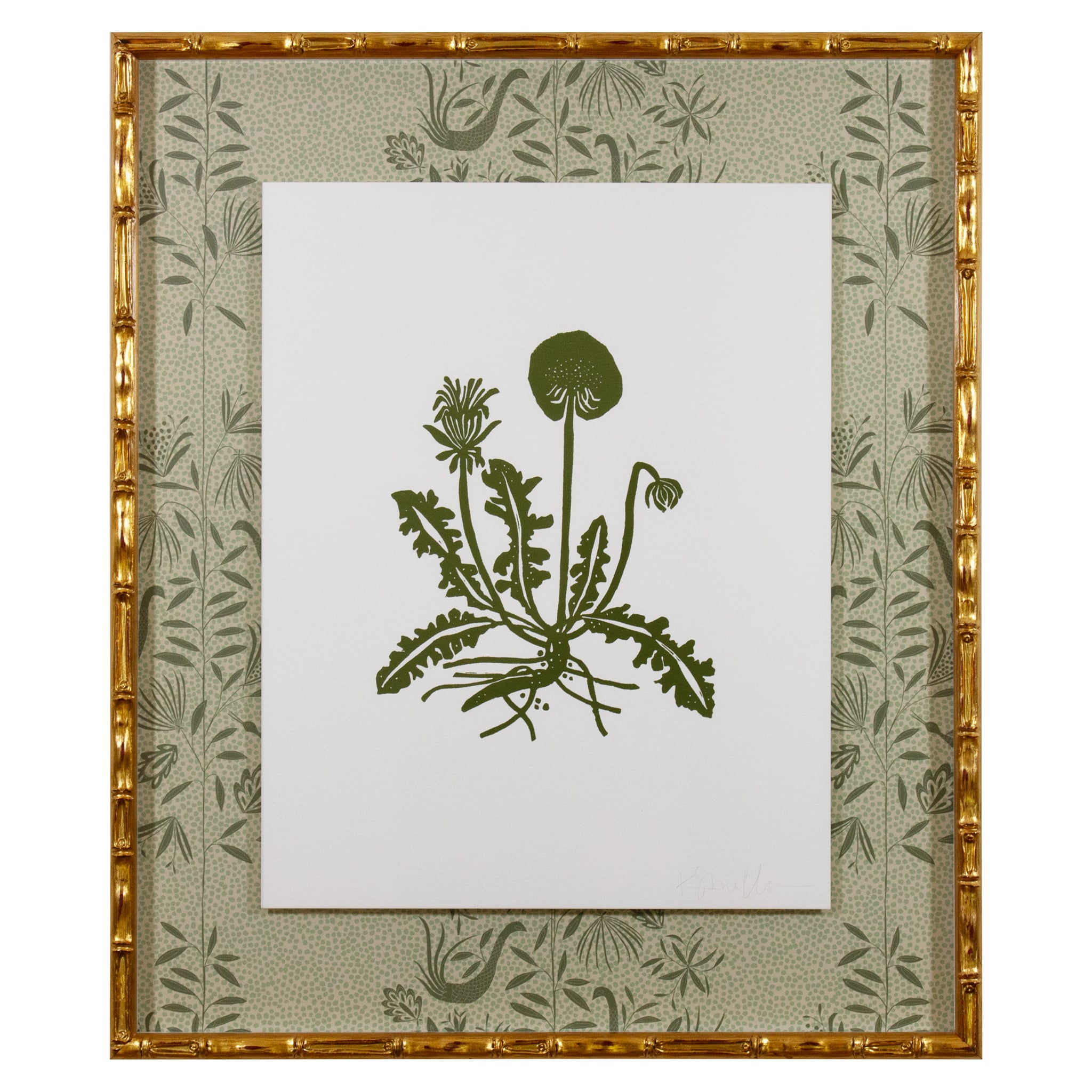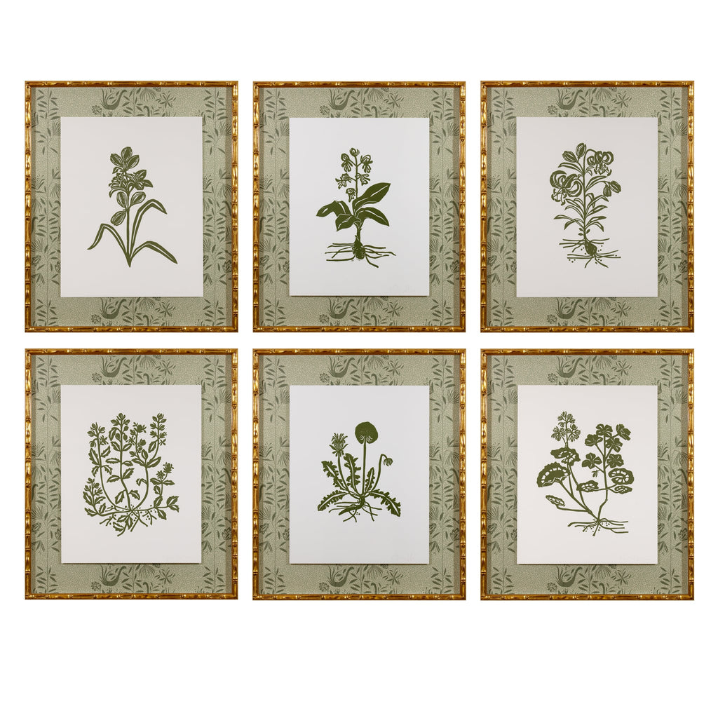 hand carved and hand printed linocut floating on garden vine wallpaper, framed in gold bamboo frame