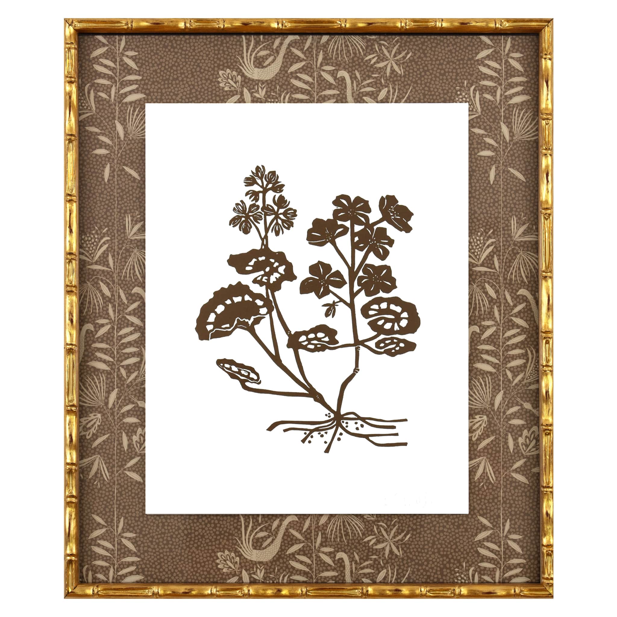 hand carved and hand printed linocut floating on garden vine wallpaper, framed in gold bamboo frame