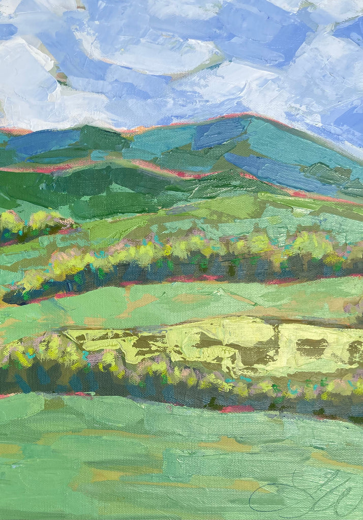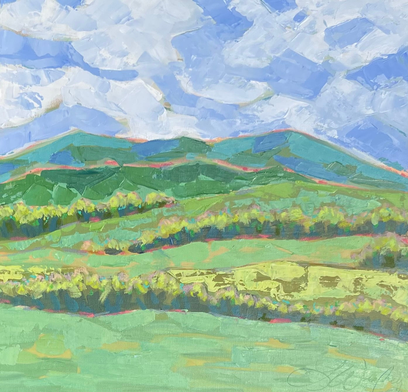Lindsey’s paintings are an escape and journey - a time to relish the process of creativity: the brush strokes, the layers, the juxtaposition of colors. She works primarily with acrylic paints for their intensity of color and the ability to layer and create textures with various acrylic mediums and gels. A native of Lynchburg, Virginia, Lindsey’s landscapes generally focus on special places that she has known all her life, including fields at the foot of the Blue Ridge Mountains and the pristine beauty of the Cowpasture River. Working from onsite sketches and photographs, she mixes observations with her own personal memories and feelings of how she perceives a place. In addition to being an artist, Lindsey is a full-time art educator, wife, and mother of two young children.