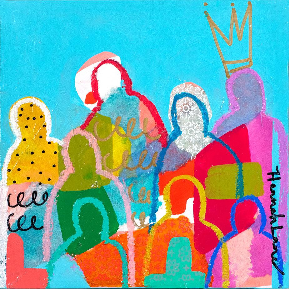 Hannah Lane is a contemporary mixed media artist celebrated for her bold use of color and dynamic, collage-like layering. A Louisiana native and graduate of the Savannah College of Art & Design, Hannah draws deep inspiration from the vibrant landscapes, diverse cultures, and heartfelt sense of family and community found in her southern roots. Her work blends pigmented Japanese papers, expressive line work, and rich washes of acrylic paint to create textured, energetic paintings. Each collection reflects her love for nature, storytelling, and community—an invitation to explore the beauty of her inner imagination. Hannah is represented by some of the top galleries in the Southeast, and her paintings are collected privately and in corporate spaces across the country. She also loves working one-on-one with collectors to create meaningful, custom pieces. After living and painting in Italy and New Orleans, Hannah now calls Nashville home, where she is part of a thriving art community. When she’s not painting in her home studio, you’ll find Hannah hiking with her boys, reading, or cooking up something seasonal and delicious! The crowd series is one of my most iconic collections, inspired by my big, beautiful Louisiana family and the joyful spirit of southern gatherings. I grew up surrounded by cousins, friends, and neighbors—many from families as large and lively as my own—where faith and family were at the heart of everything. Over the past 12 years, this series has evolved with new patterns, papers, and symbols that reflect the changing seasons of life. Each crowd painting is a kind of meditation, a reflection on the deep truth that we’re all connected. Rich with personal symbols and intuitive mark-making, these pieces push the boundaries of mixed media and invite you to see something familiar in a new way. Whether you're drawn to the vibrant energy, the quiet details, or the sense of belonging they evoke, each crowd carries its own unique aura—waiting for the right person to bring it home.