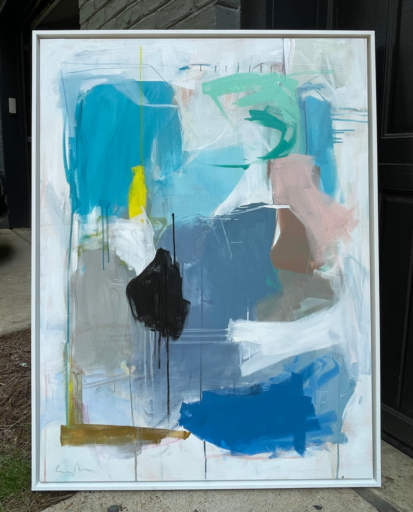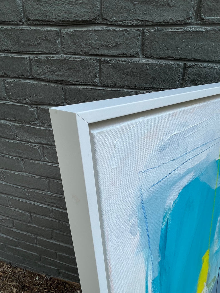 acrylic and oil pastel on gallery wrapped canvas, in white floater frame