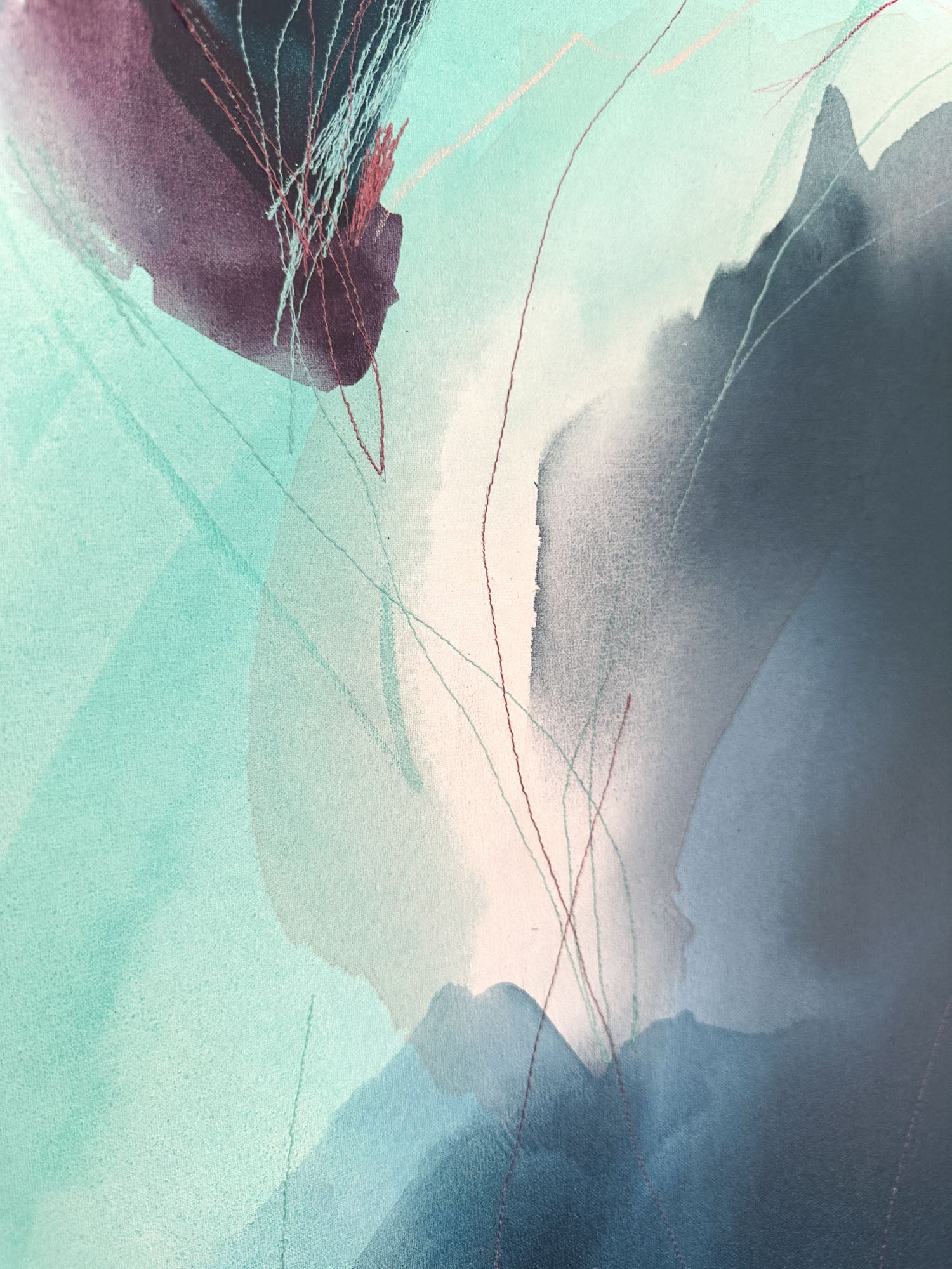 Deeann has a BFA from Memphis College of Art with a painting emphasis and has always been drawn to mixed media and collage. She took several fiber arts classes in college where she learned machine embroidery and sewing techniques. When she began working abstract a few years later, she combined these two techniques and found her own creative voice. She uses a sewing technique called free-motion machine embroidery on top of painted papers and incorporates those papers as collage.The stitched lines sit on top of fluid ink washes, colliding with bold paint scrapes and embellishing each piece with texture and delicate line, like veins running through the painting. “I am drawn to the tactility that the embroidery adds to the work both aesthetically and conceptually. The nature of thread is strong but intricate; it has a sort of permanence with the appearance of fragility.” Deeann has been in Nashville since 2018 and paints full time in her home studio with her two young daughters nearby.