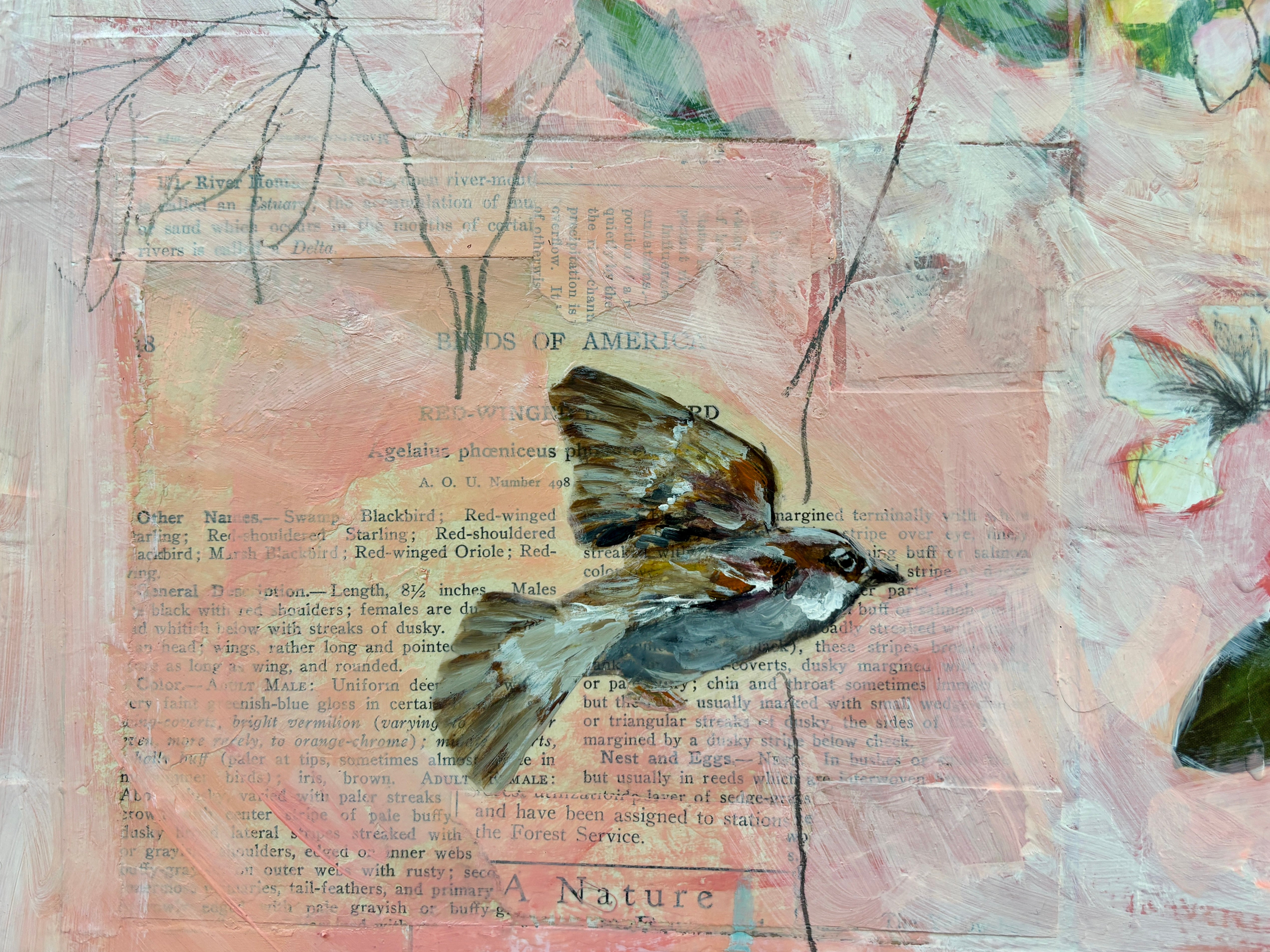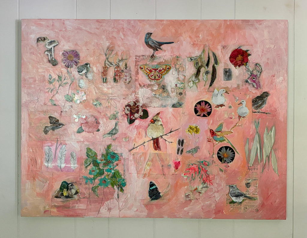 A lifelong artist, I make art because coming up with an idea is what gets me out of bed in the morning and into my studio, mercifully located in my home. So much of what I love in life is at home- my pets inside and wildlife out, nature pouring through the windows, comfortably cluttered rooms full of books and art, the forest surrounding me. My art originates with that early morning idea, a daily walk in the woods, the imagery around me. The deep connection to my surroundings is reflected in the art I make, even using pages of books in my art and the book itself as the canvas with the animals love as the subject. Animal and landscape renderings in mixed media, storytelling dioramas and large works on canvas all have a similar feel of natural wonder.