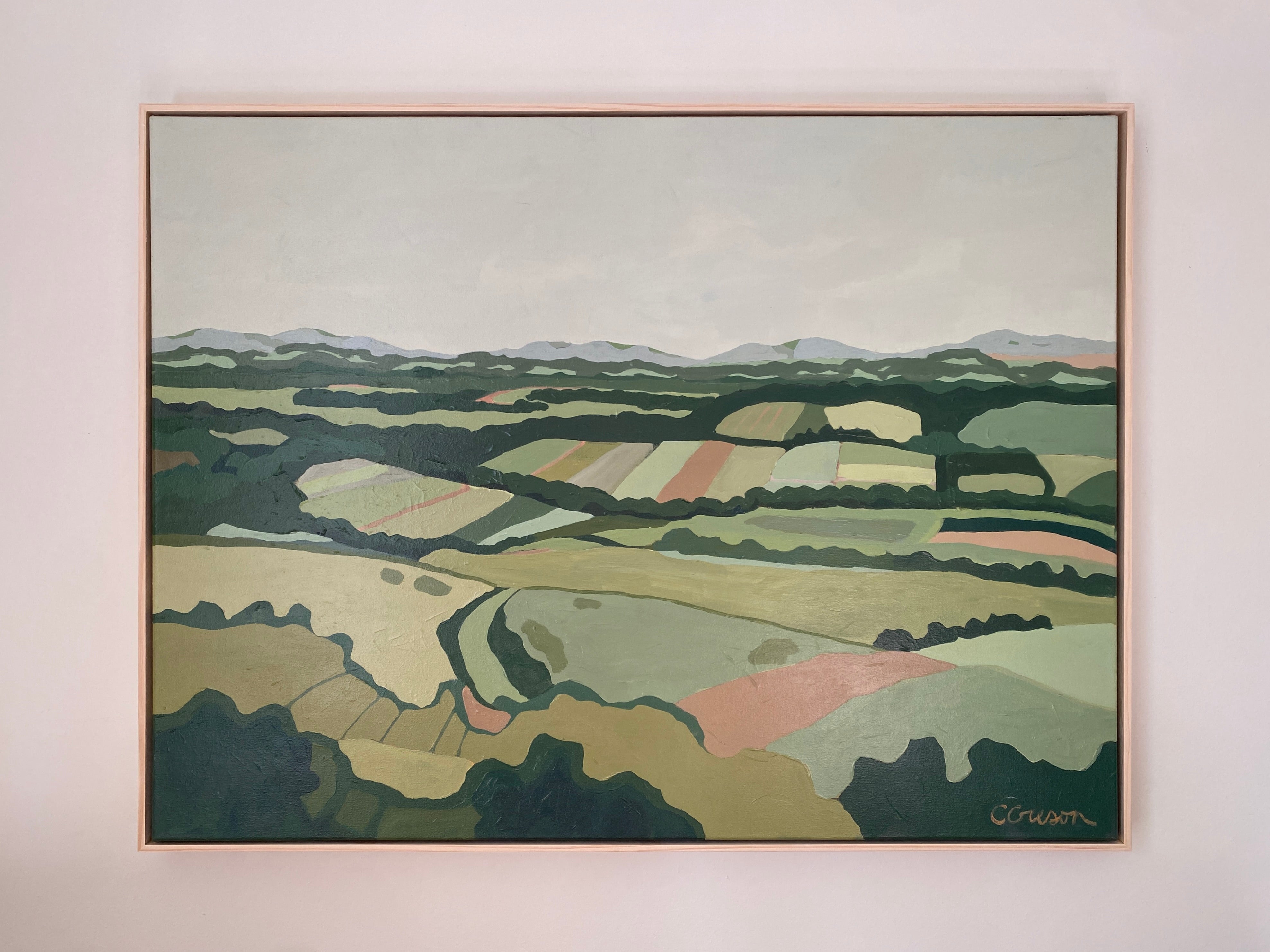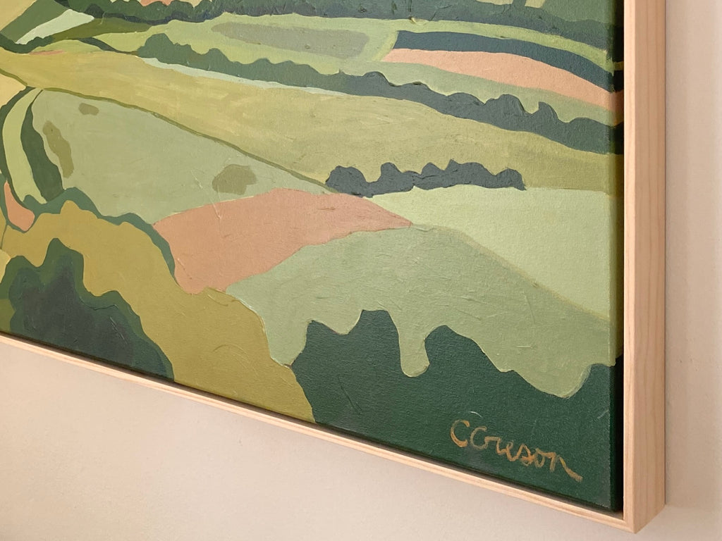 acrylic on stretched canvas, framed in natural wood floater frame