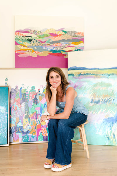 Hannah Lane is a contemporary mixed media artist celebrated for her bold use of color and dynamic, collage-like layering. A Louisiana native and graduate of the Savannah College of Art & Design, Hannah draws deep inspiration from the vibrant landscapes, diverse cultures, and heartfelt sense of family and community found in her southern roots. Her work blends pigmented Japanese papers, expressive line work, and rich washes of acrylic paint to create textured, energetic paintings. Each collection reflects her love for nature, storytelling, and community—an invitation to explore the beauty of her inner imagination. Hannah is represented by some of the top galleries in the Southeast, and her paintings are collected privately and in corporate spaces across the country. She also loves working one-on-one with collectors to create meaningful, custom pieces. After living and painting in Italy and New Orleans, Hannah now calls Nashville home, where she is part of a thriving art community. When she’s not painting in her home studio, you’ll find Hannah hiking with her boys, reading, or cooking up something seasonal and delicious! The crowd series is one of my most iconic collections, inspired by my big, beautiful Louisiana family and the joyful spirit of southern gatherings. I grew up surrounded by cousins, friends, and neighbors—many from families as large and lively as my own—where faith and family were at the heart of everything. Over the past 12 years, this series has evolved with new patterns, papers, and symbols that reflect the changing seasons of life. Each crowd painting is a kind of meditation, a reflection on the deep truth that we’re all connected. Rich with personal symbols and intuitive mark-making, these pieces push the boundaries of mixed media and invite you to see something familiar in a new way. Whether you're drawn to the vibrant energy, the quiet details, or the sense of belonging they evoke, each crowd carries its own unique aura—waiting for the right person to bring it home.