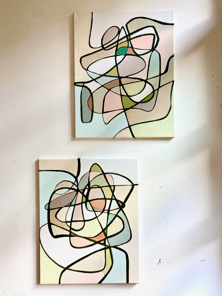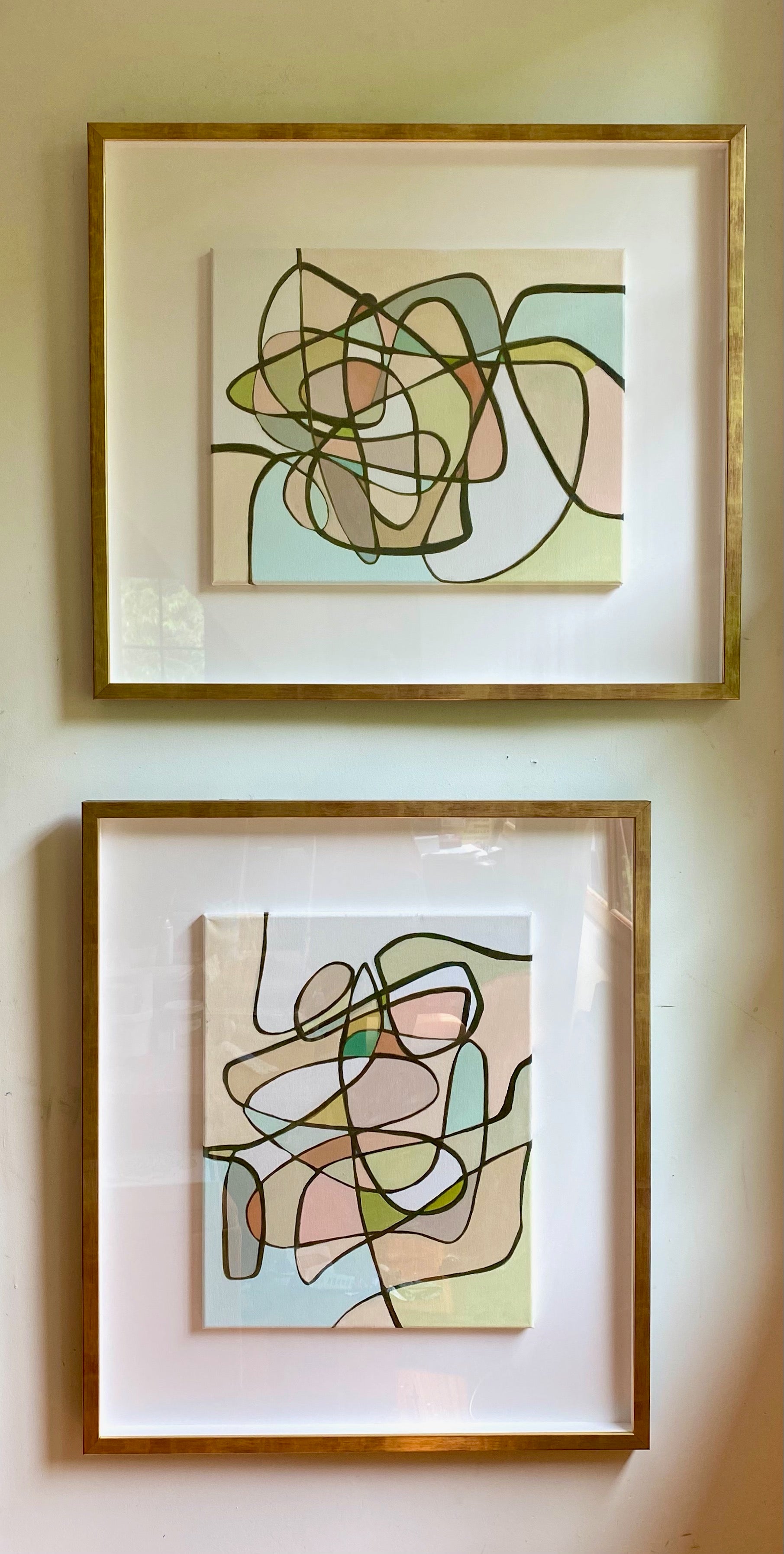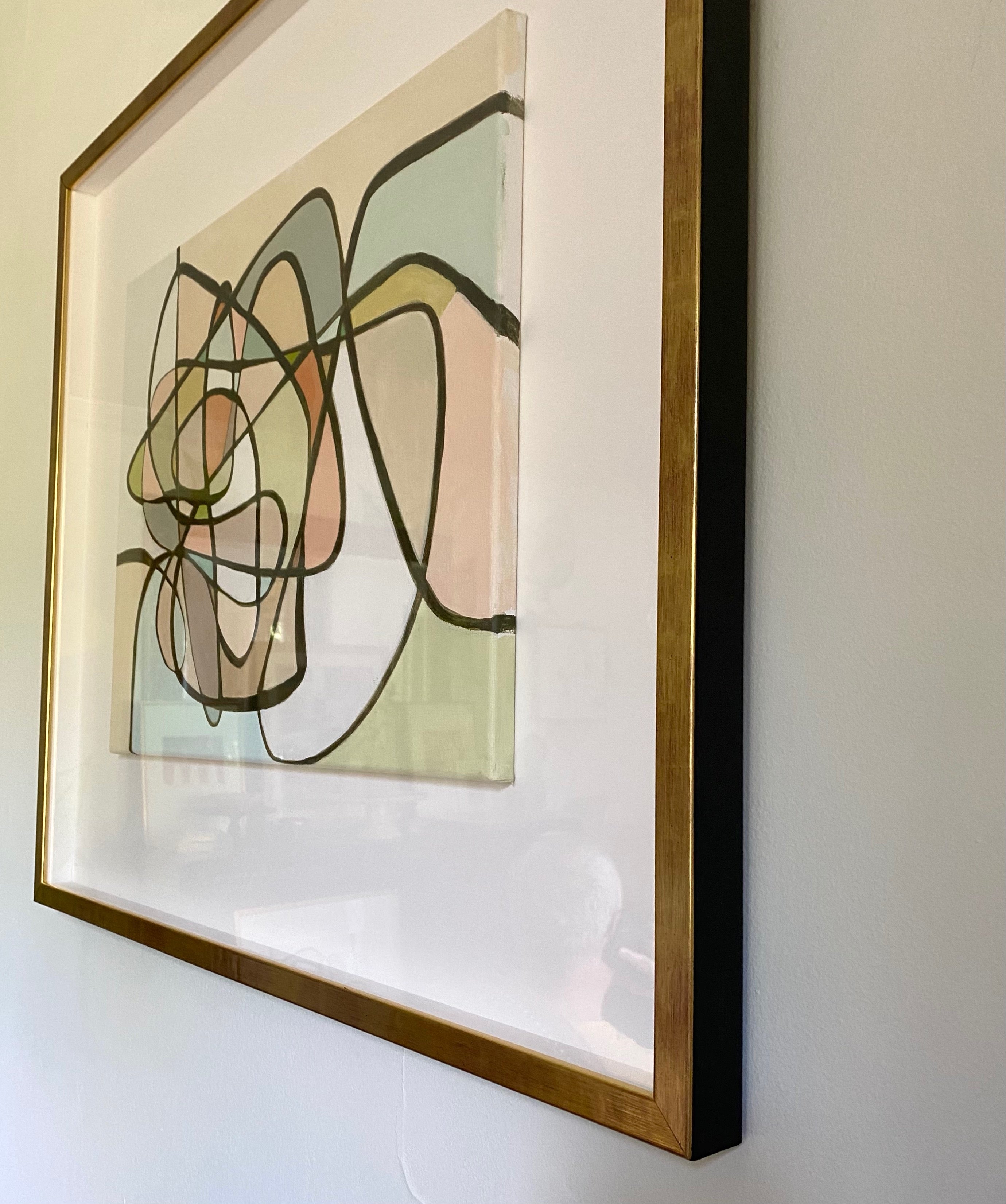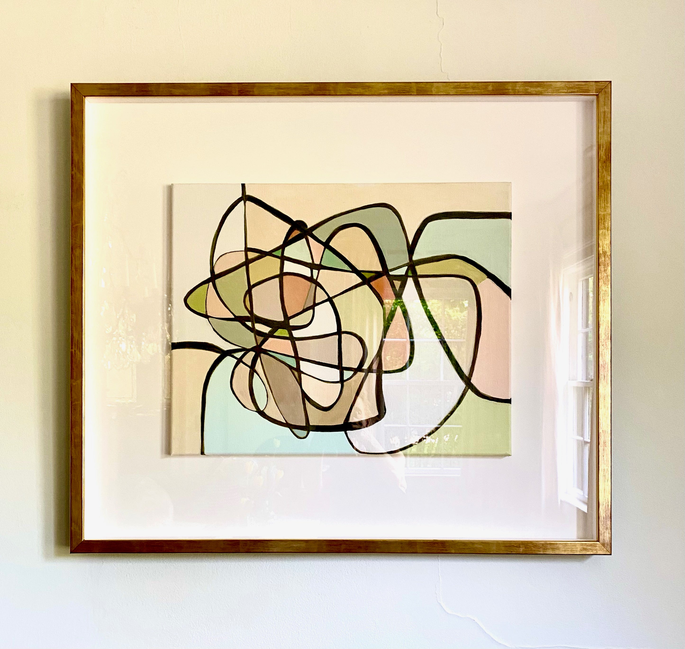 acrylic on canvas, matted and framed behind glass, black and gold frame
