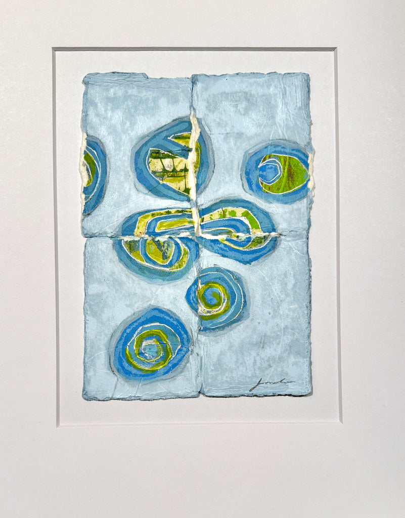 acrylic and oil paint with white pen and ink on heavyweight watercolor paper, in white mat