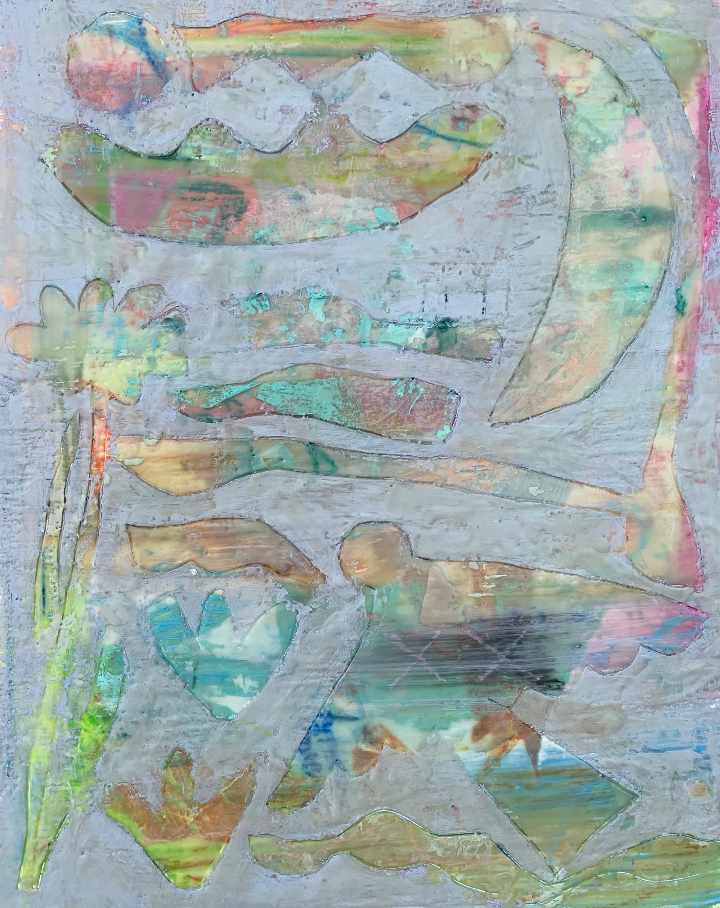 Margaret Meredith is an abstract painter working in acrylic and mixed media. Her work explores emotional atmosphere through layered surfaces, intuitive mark‑making, and a palette that balances moody, muted tones with moments of vivid color. Her recent work builds on botanical themes first explored in 2023, suggesting organic growth and memory rather than literal representation. Alongside this, Meredith has created minimalist, encaustic-medium, and collage‑based works that continue to inform her layered approach. Currently, she is focused on acrylic painting, embracing its fluidity and the freedom to work with water. Pencil marks, printed elements, stencils, and hand‑made tools play an ongoing role in her process, reflecting her love of printmaking and experimental mark‑making. Margaret Meredith lives and works in Columbus, Georgia, with her husband, a woodworker and mushroom farmer, and their two sons.