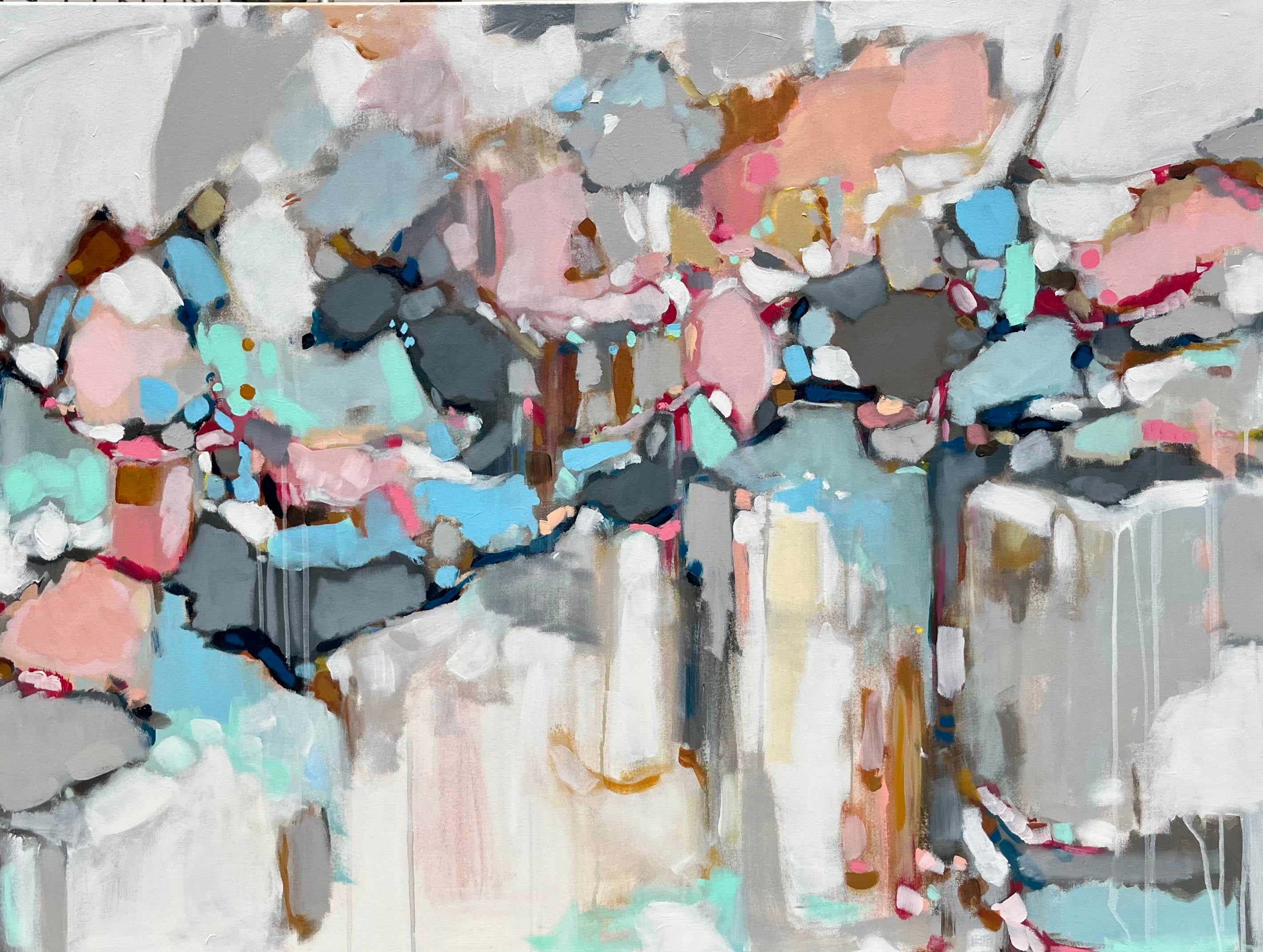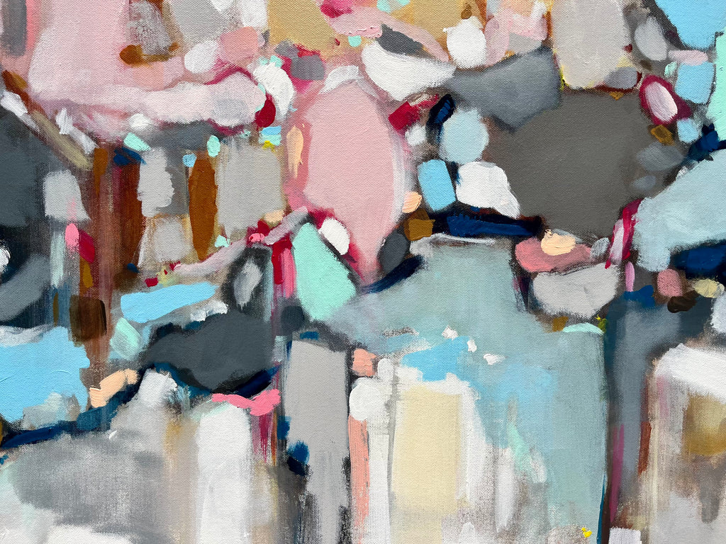 Michele James is an abstract painter known for her large works on canvas. She is inspired by color and movement and uses strong brushstroke and varied marks on neutral canvases with pops of bold colors. She paints with acrylics , and uses chalk, oil pastels and pencil to vary the texture and medium of her works. She is influenced by the colors in nature, the lightness and space of the sky, and the texture and depth of landscapes. “I love to make people happy and for a client to add my painting to their home is wonderful compliment” Michele received a BFA in fine art and art history at Hunter College in New York, NY with a concentration in studio painting. Michele paints out of her home studio in Atlanta where she lives with her husband and three kids.