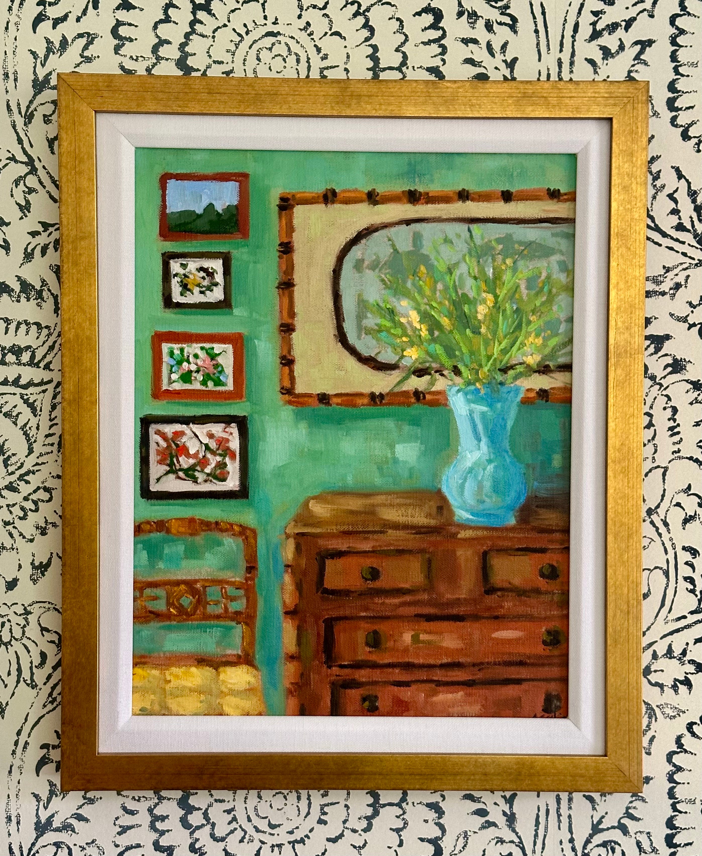 oil on linen panel, framed in gold frame with linen liner