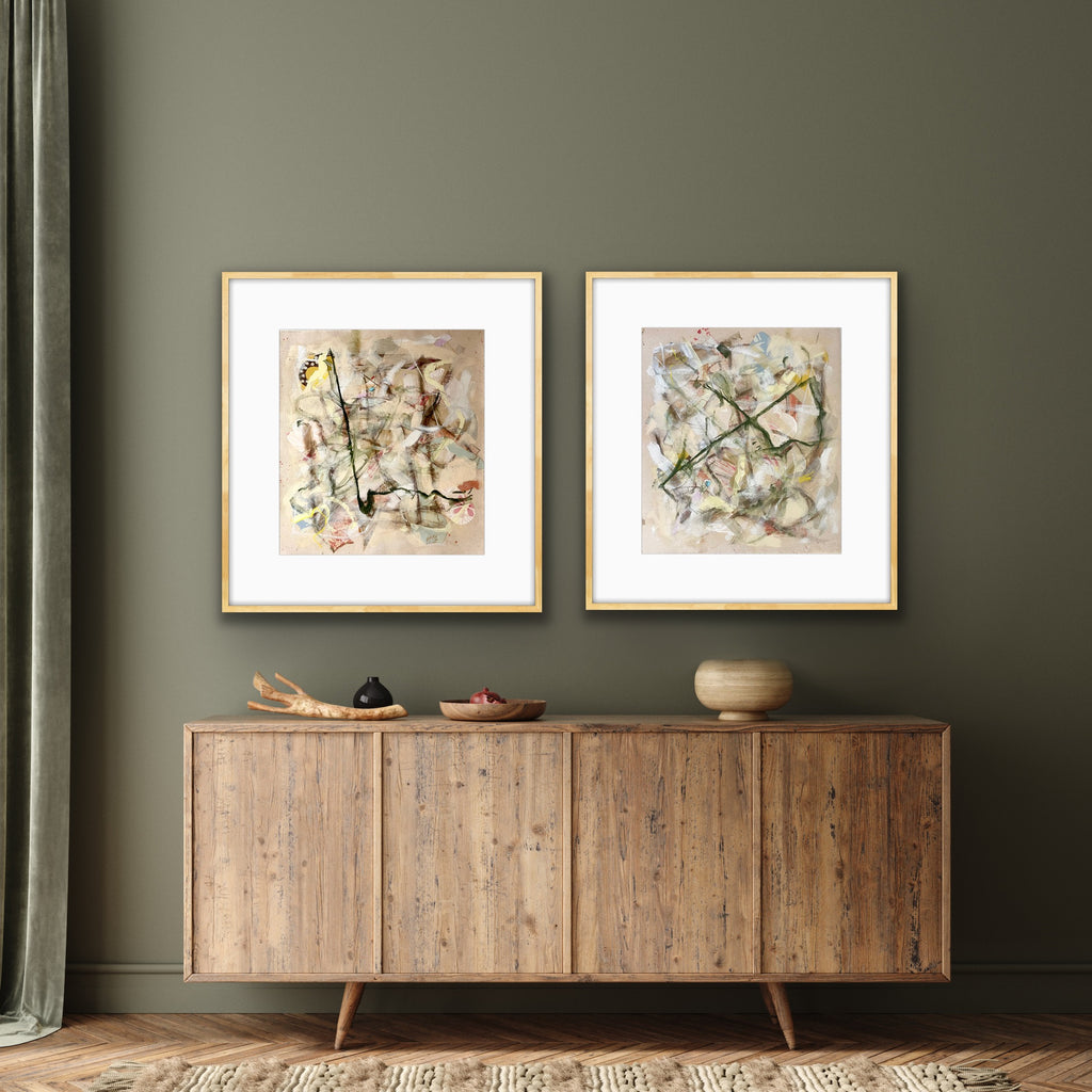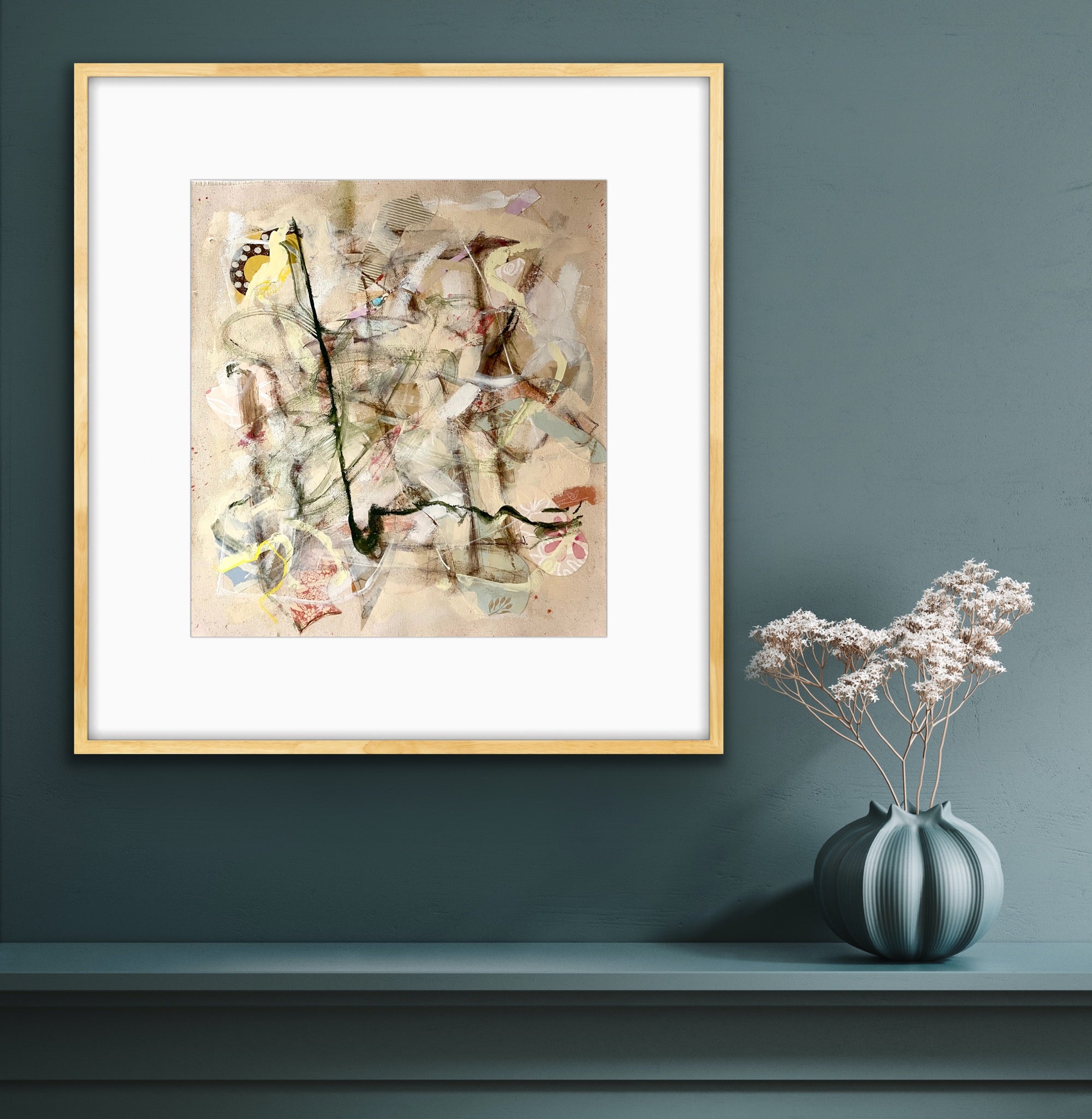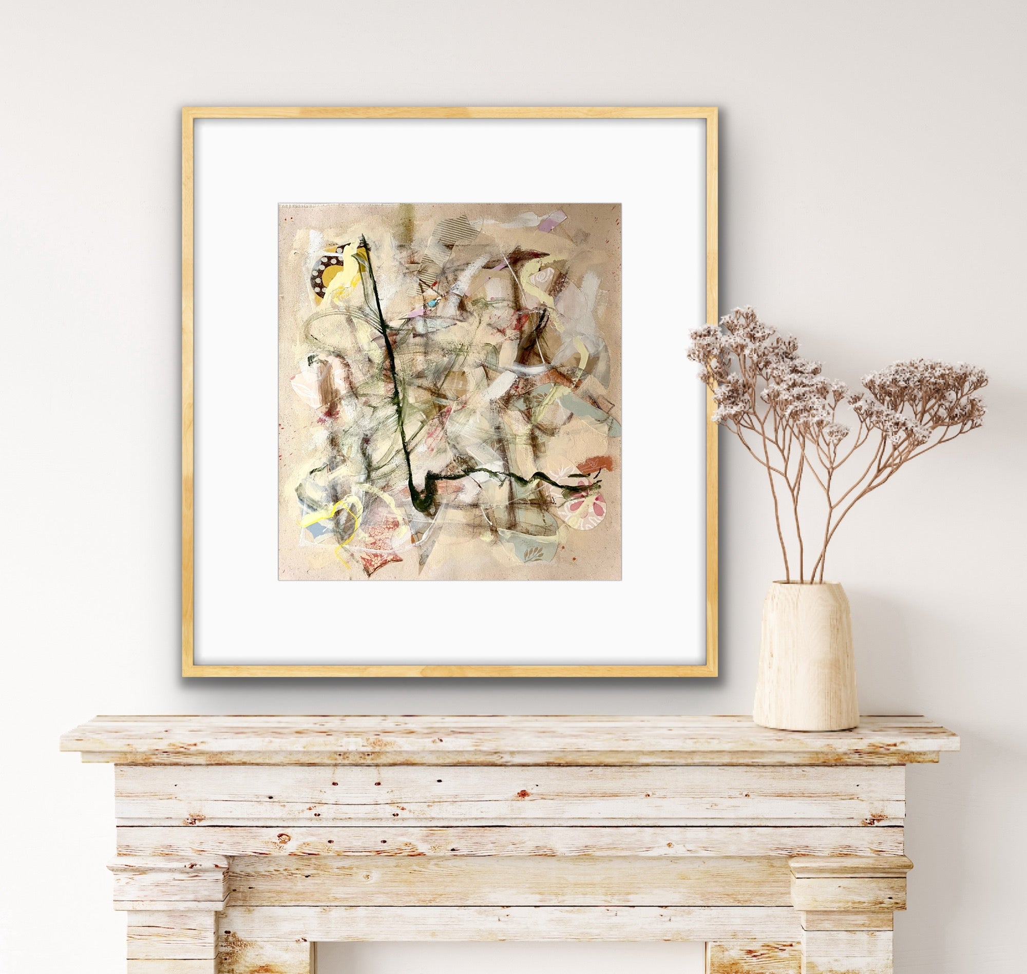 mixed media on heavy canvas, floating on mat, in gold frame with glass