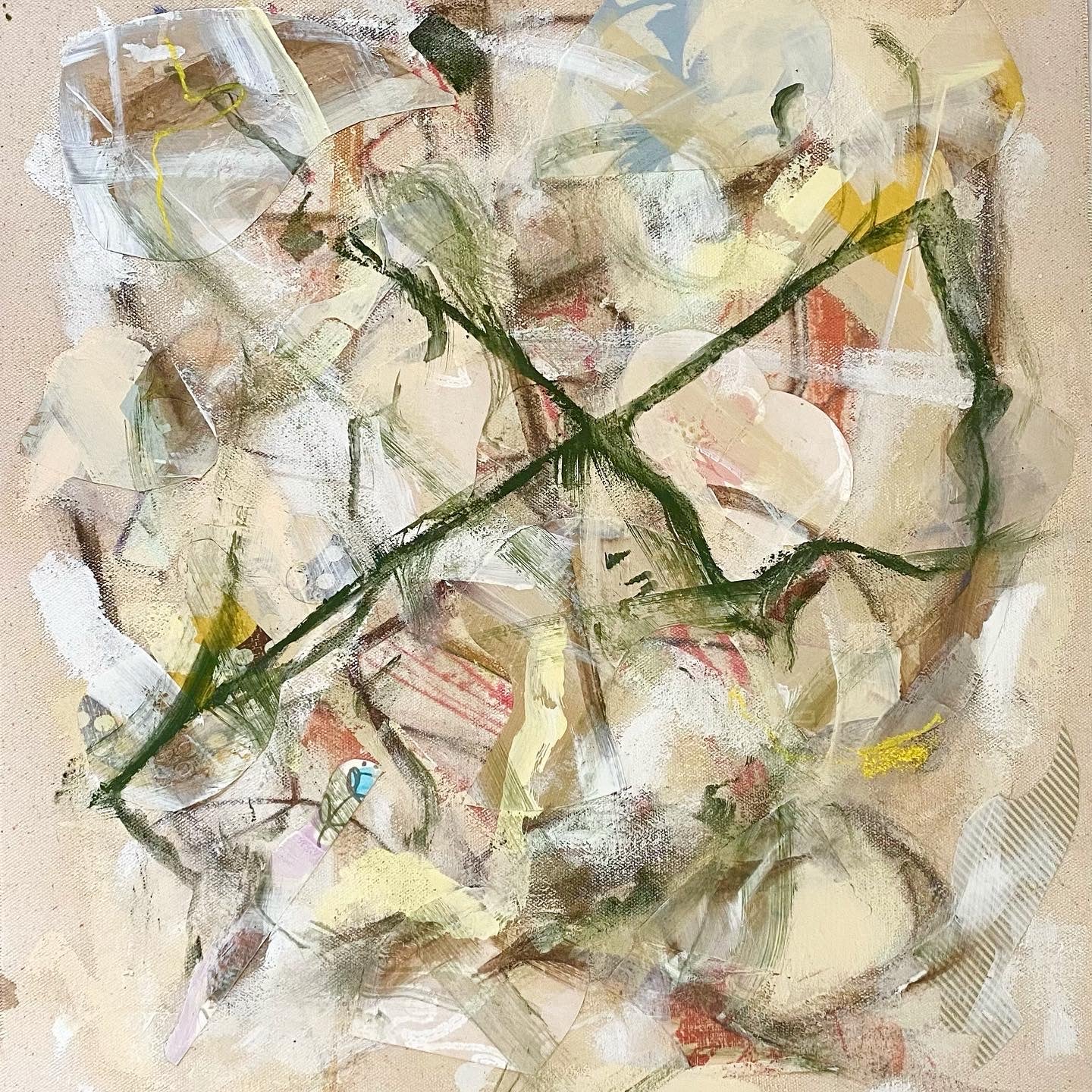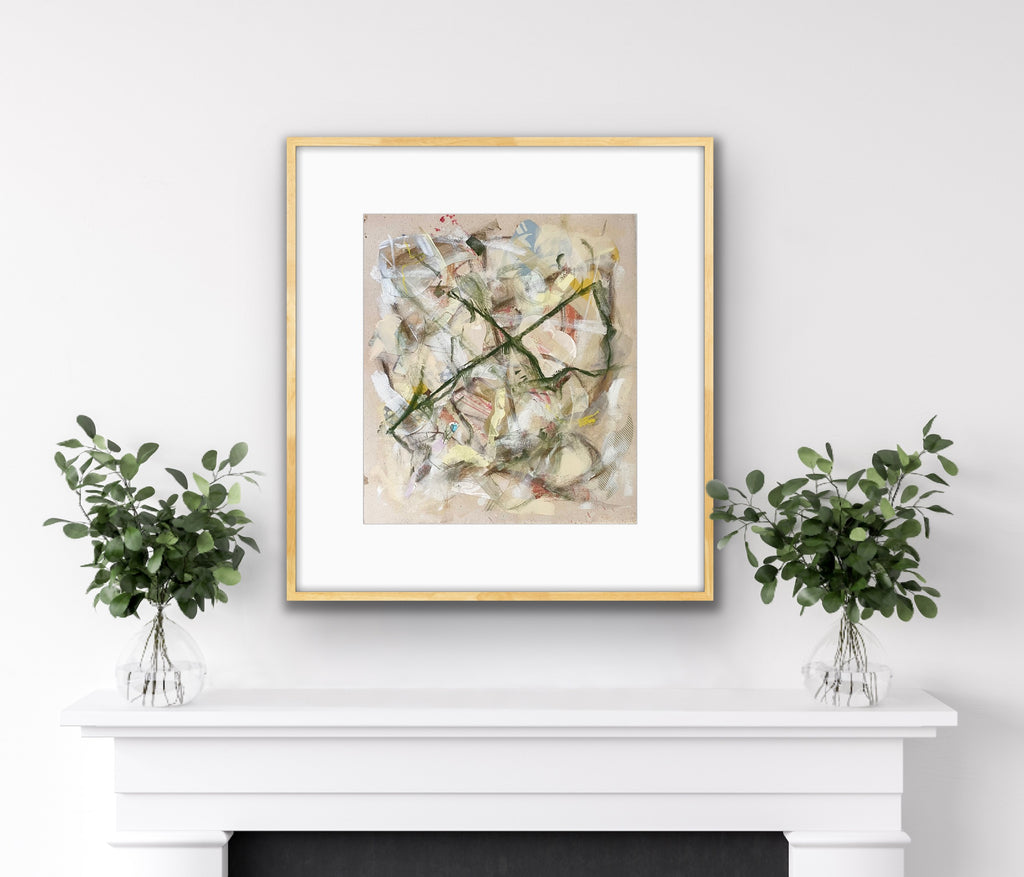 mixed media on heavy canvas, floating on mat, in gold frame with glass