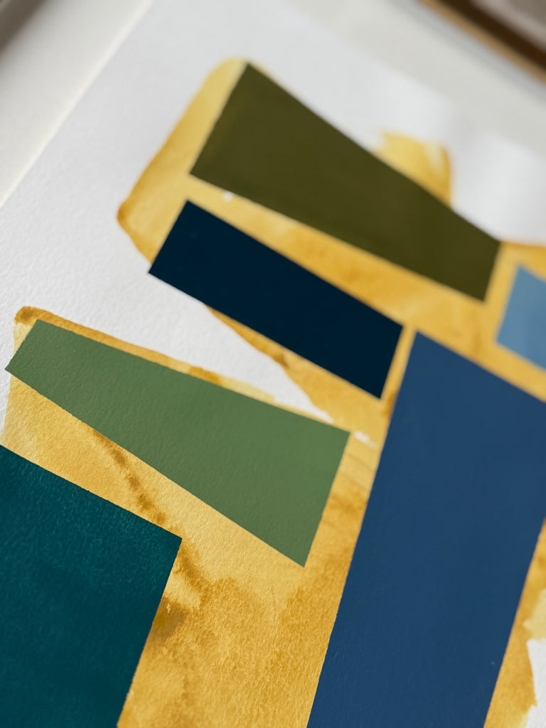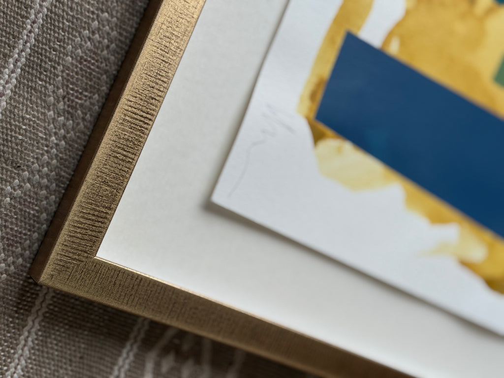 acrylic on heavyweight paper, floating on white mat in gold frame