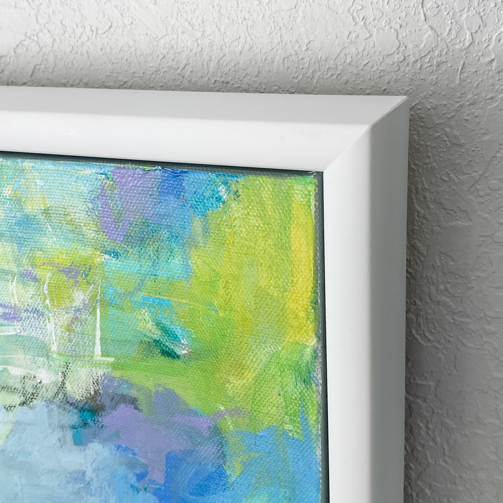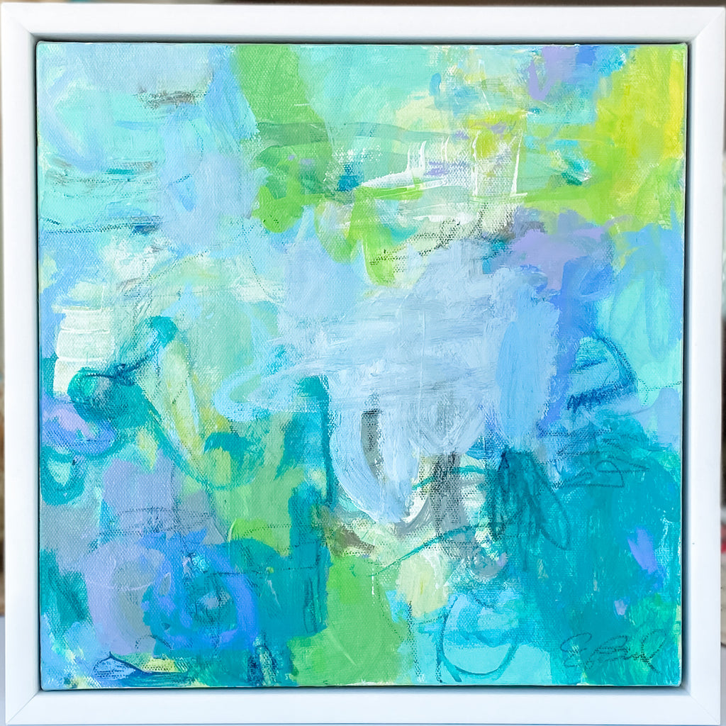 mixed media on canvas, in white floater frame