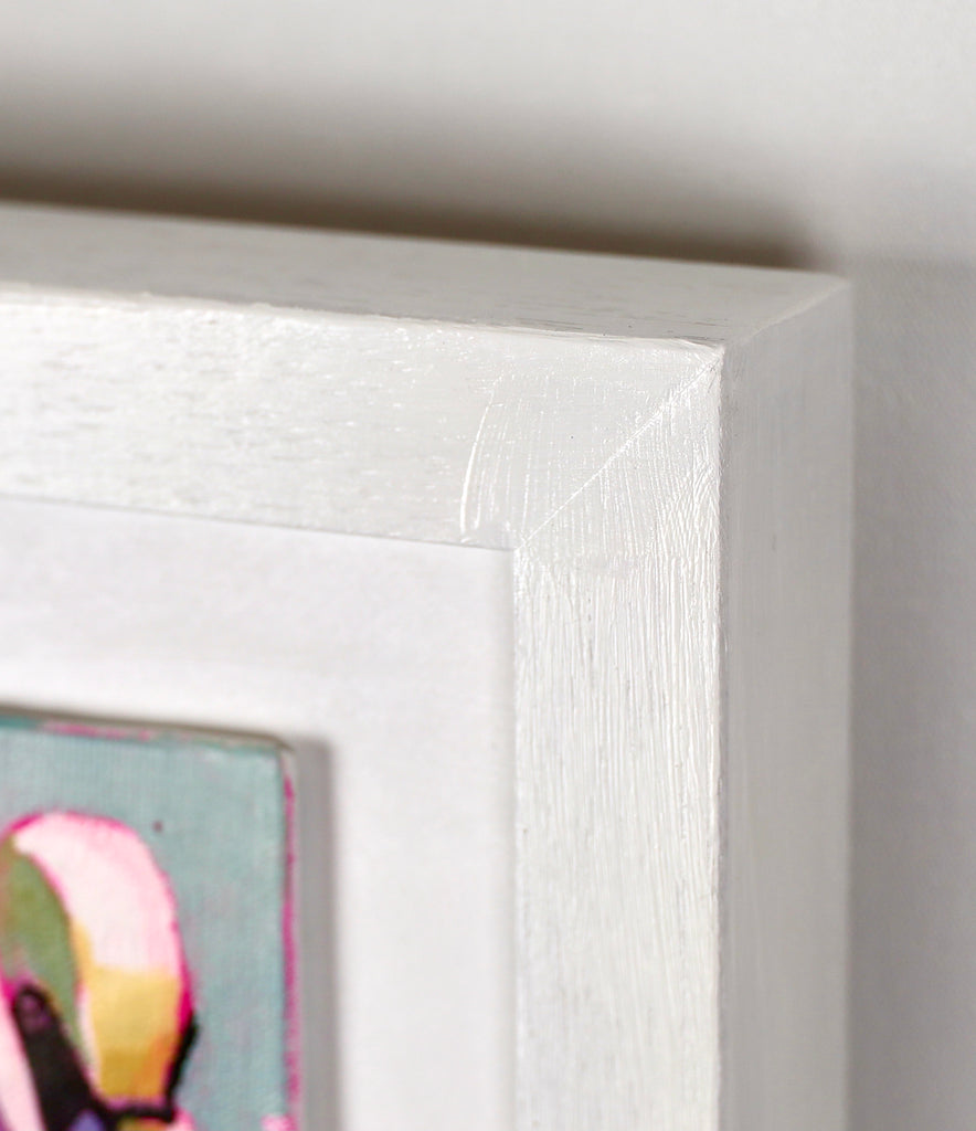 oil on linen board, mounted and framed in white wood