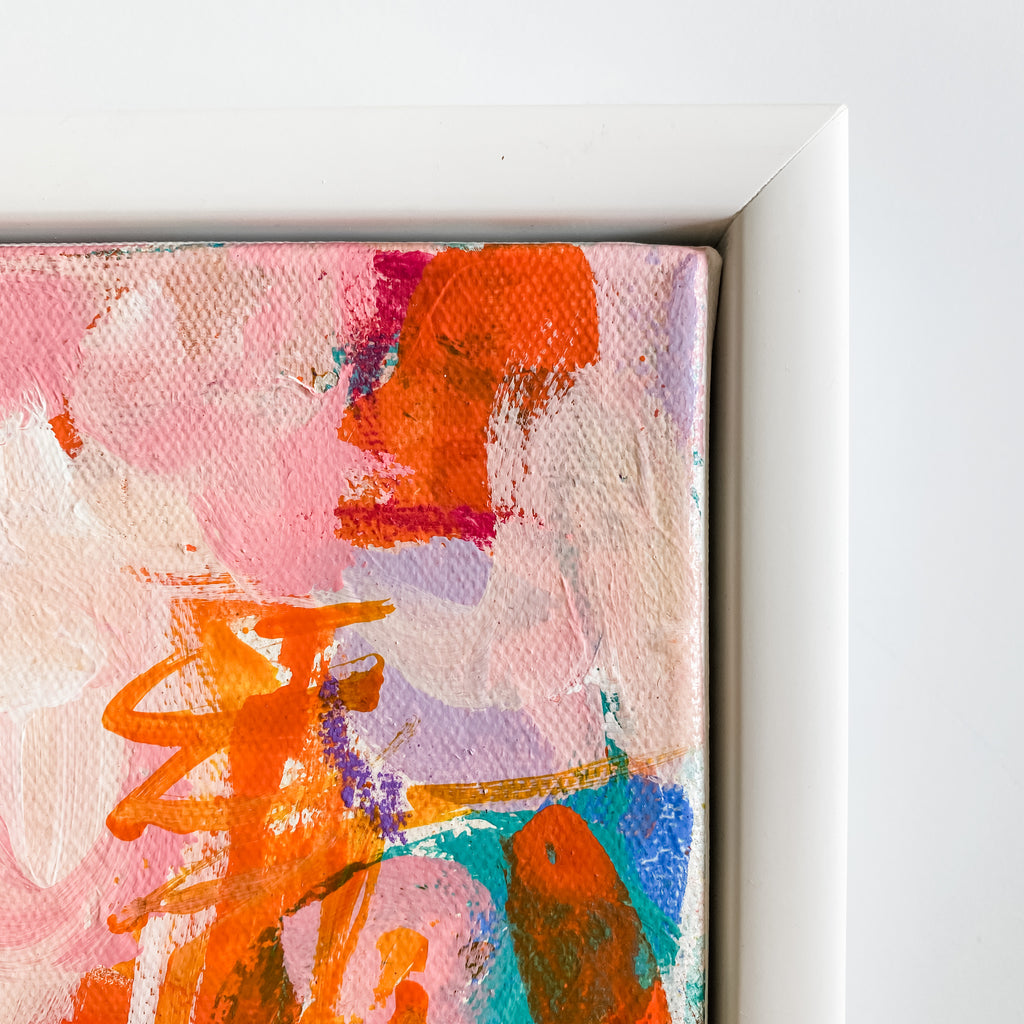 acrylic and mixed media on canvas, in white floater frame