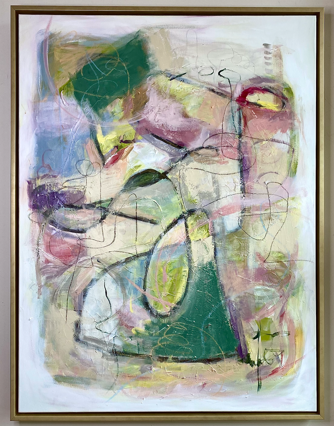 mixed media on canvas, gold floating frame