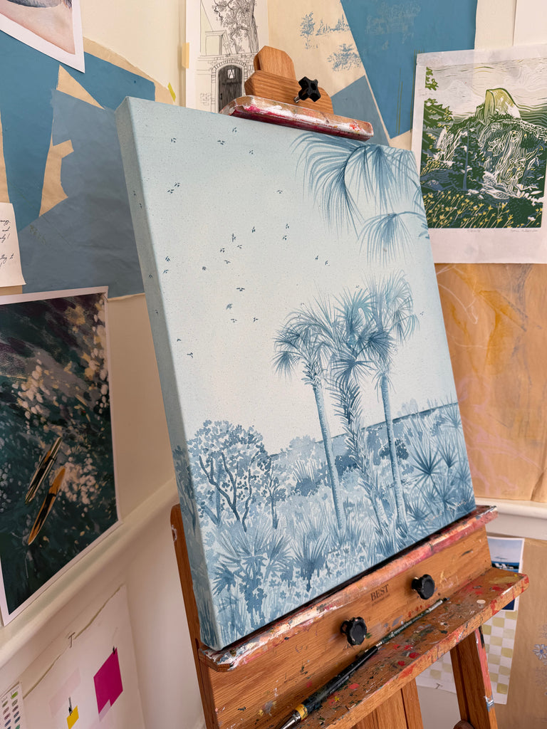 Much of Sarah Schools’ work reflects the warm, seasonal glow of the Carolinas. As both an oil painter and watercolor artist, she finds joy in discovering color in unexpected places—whether it's the dreaminess of golden hour, the soft depth of a cornflower blue shadow, or the delicate light that appears when the sun hits just right. Her creative process often involves experimenting with color to convey mood and atmosphere, layering bright hues and subtle tones with careful detail. Recently, she has been especially drawn to the flora and fauna of the Southeast, capturing native plants, trees, and the wildlife that inhabit them.
