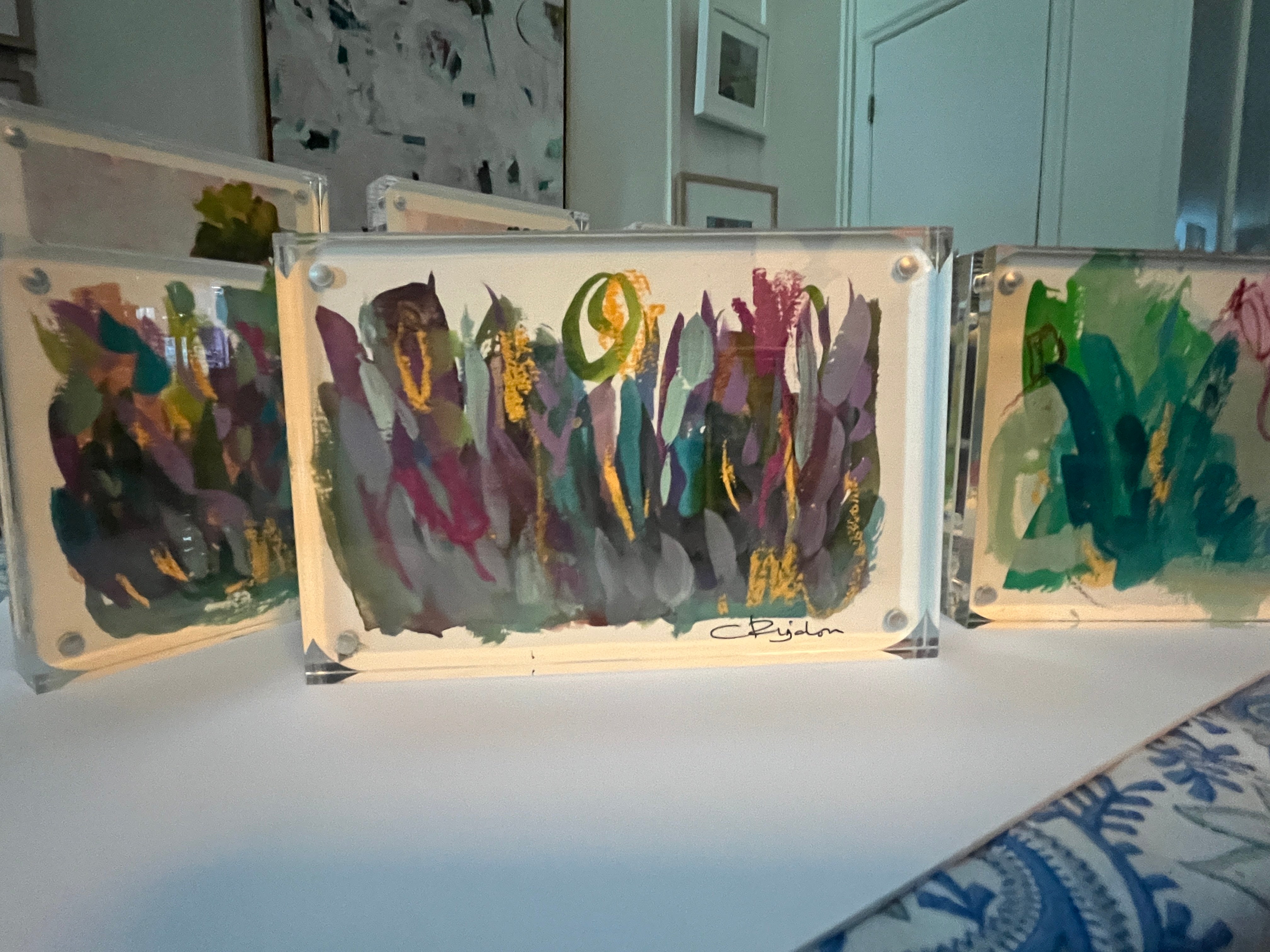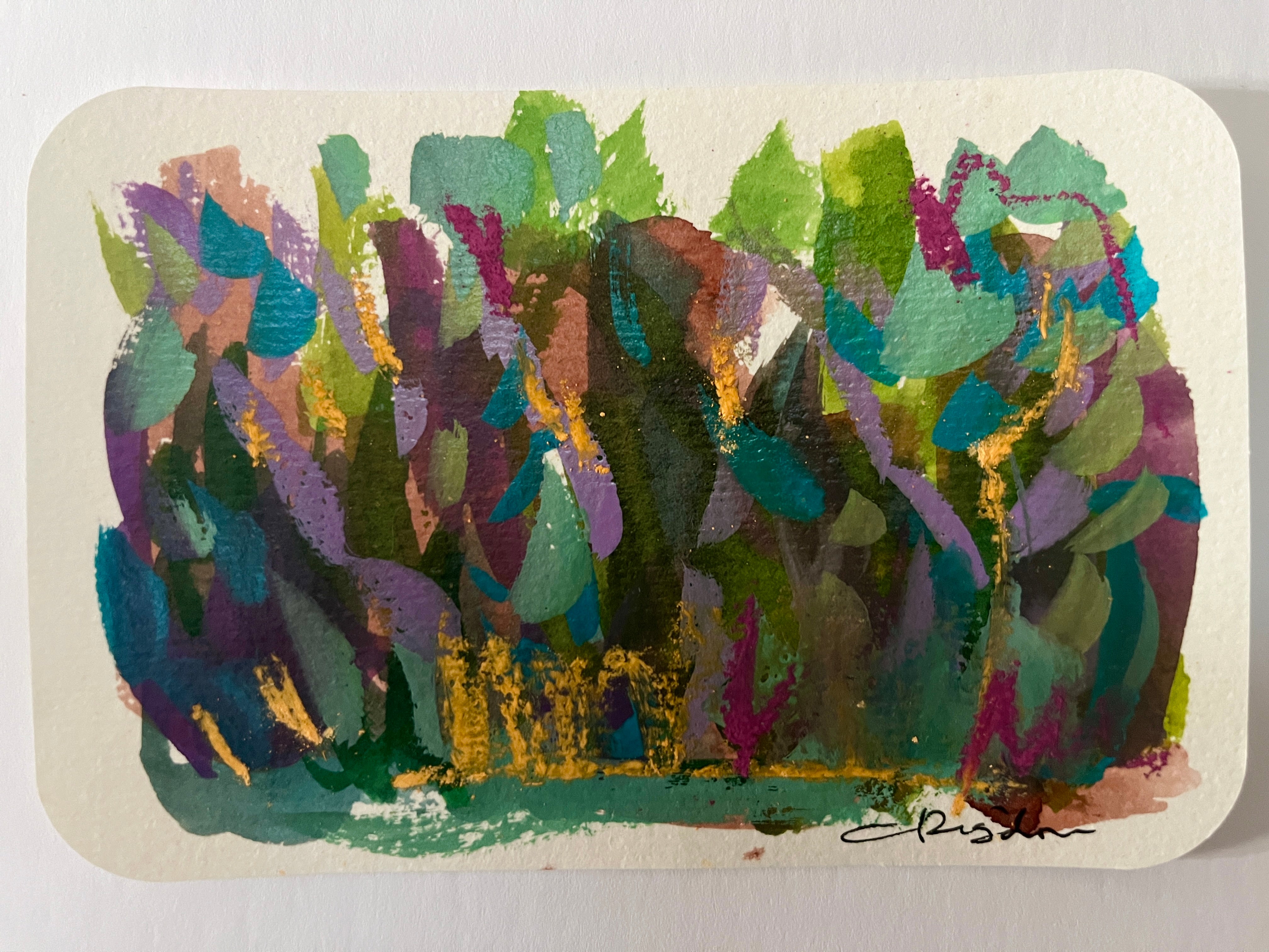 I find ultimate freedom in abstract expressionism and as such, I’m in search of the best way to convey who I am at the moment of creating. It is not to say it is a free-for-all; there is still structure within. I implement the same principles that realist painters employ with the absence of representation: composition, hierarchy, variety, juxtaposition are vital to a successful painting. But I do not limit myself to one medium or the other. I work in oil, acrylics and gouache and depending on what I’m exploring at the time I will choose one or more to express it. I also explore through a combination of paint and collage. It is through all of these various methods and mediums that I am able to share my fullest expression of self and my authenticity. My paintings ultimately are self portraits that are created from both past experiences and also future hopes and dreams. It is my goal to invoke a feeling for the viewer. When it does I have succeede
