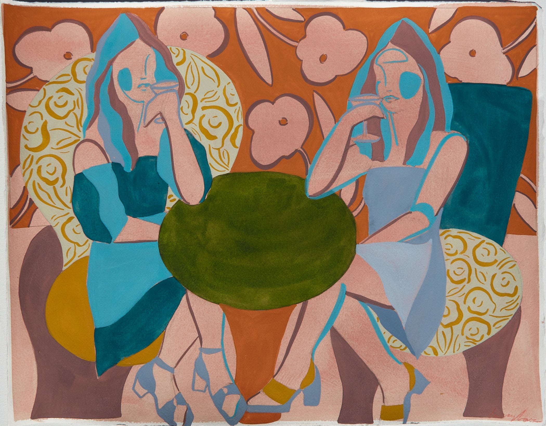 My name is Lizzy Love and I'm an artist in Nashville, TN. I create figurative works on canvas with acrylic paint and papers with watercolor and gouache. This body of work has been a rebirth for me creatively. While I've been painting full time for the last 5 years, I feel like I've really come into myself creatively with my figurative paintings. Born out of a time of uncertainty and lots of questioning, I was pushed to dig deep and get back to basics. I decided to switch gears from painting the landscapes, for which I had been primarily making for years. As an effort to get my creative spark back, I started sketching figures from magazines, a subject I hadn’t explored in a long time. Over many months they slowly evolved into what they have become; starting from detailed and realistic, to more abstract and modernist. I am a big believer that the environment of your home shapes your attitude, and for that reason I love interior design. That love is what led me to start incorporating furniture / interior surroundings / and patterns into the pieces. I pull apart and put back together the lines and shapes of many of my favorite interiors, and place them amongst the figures in a dynamic way. These ladies embody many things - community, respect, femininity, reverence. They are a way to draw attention to what being a woman entails. Many times it means being fierce and strong. Many times it means leaning on and drawing your strength from friends that are like family. While creating each piece, I draw upon the love and reverence I have for all the women in my life; the women who have shaped me, lifted me up when I needed it, laughed with me, and inspired me.