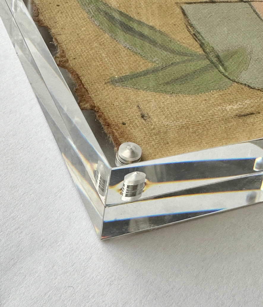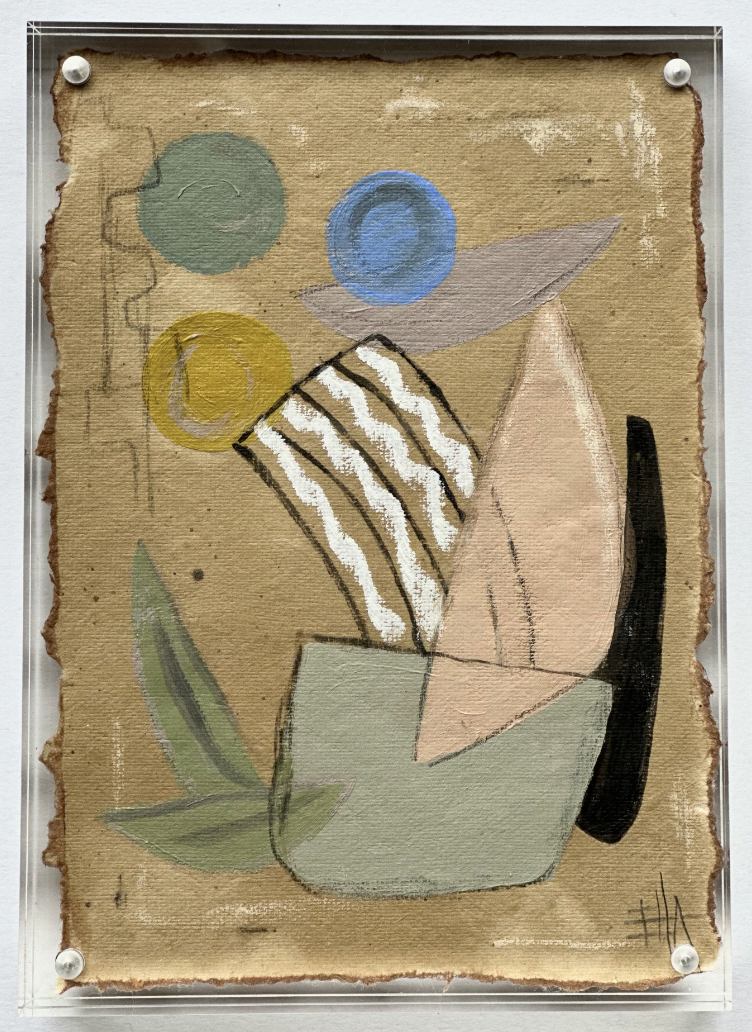 thick vintage journal paper, hand torn then edged on watercolor and finished with pastels and acrylic. Framed in acrylic block frame