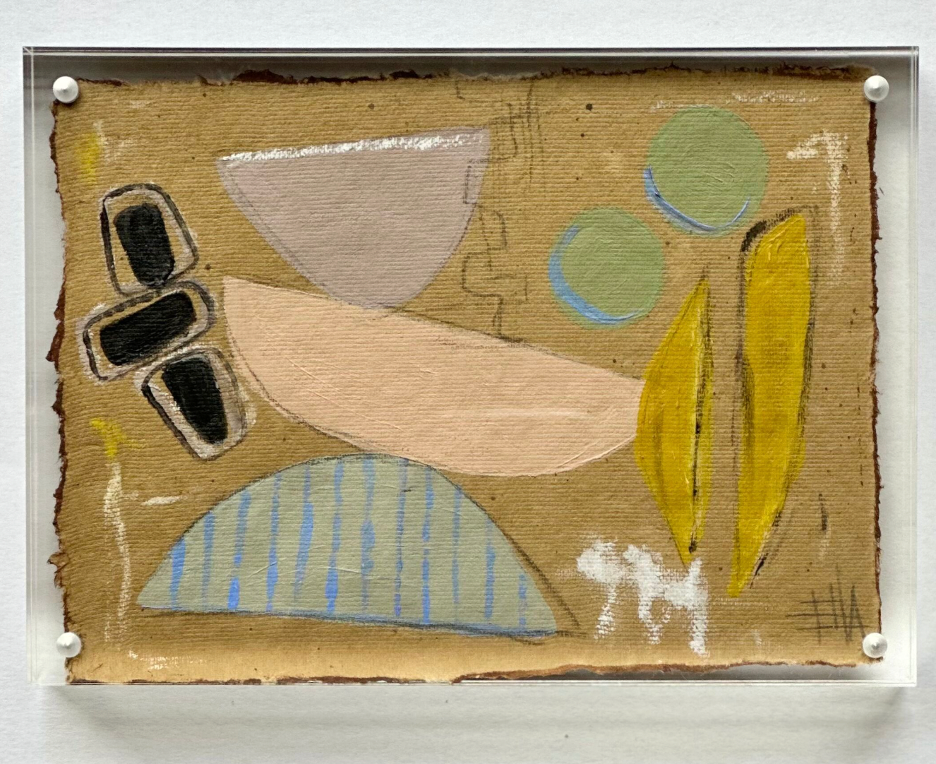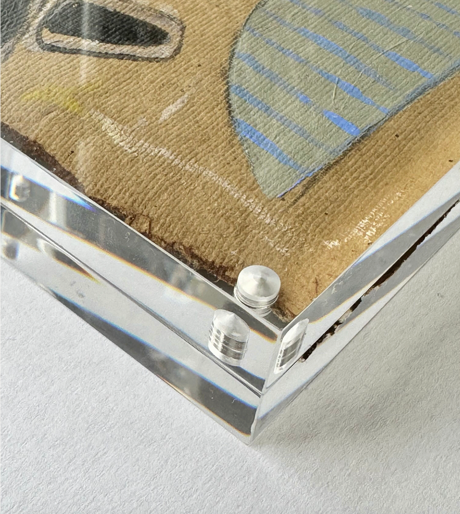 thick vintage journal paper, hand torn then edged on watercolor and finished with pastels and acrylic. Framed in acrylic block frame